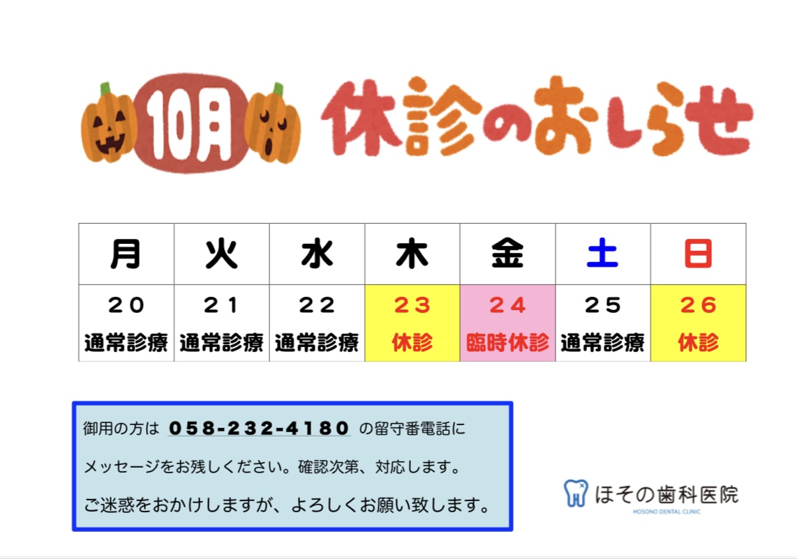 10月の休診のお知らせです。ご迷惑おかけしますがよろしくお願いします。